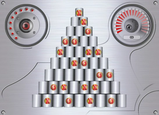 The game consists of a 3D shooting gallery in which the player must shoot targets within a stack of metallic cylinders. The structure of the targets defies common-sense intuition, which would have the player believe they are shooting a stack of hollow metal cans; in fact, the stack does not consist of hollow cans but rather solid cannisters, each containing a removable cylindrical core running in a parallel line with the player's point of view. Shooting these cylindrical cores will cause them to pop out of the surrounding cannister, whereas shooting any other part of the cannister will register as if the player shot an immovable metallic statue. Upon clearing all the cores that display the target symbol shown in the top-left corner, the entire 3D stack will rotate 90 degrees, and a new array of targets will become visible. The objective is to clear the targets as quickly and accurately as possible. The game ends once the player runs out of ammo.