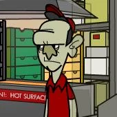 - Click the "Order Placed" sign -- when he sits on the fryer, click the water.